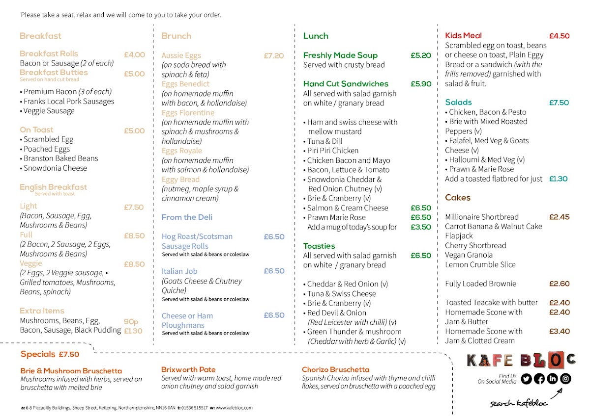 Welcome to Kafe Bloc, a charming café nestled in the heart of Kettering. This delightful eatery offers a menu that celebrates wholesome comfort food, perfect for breakfast and brunch.